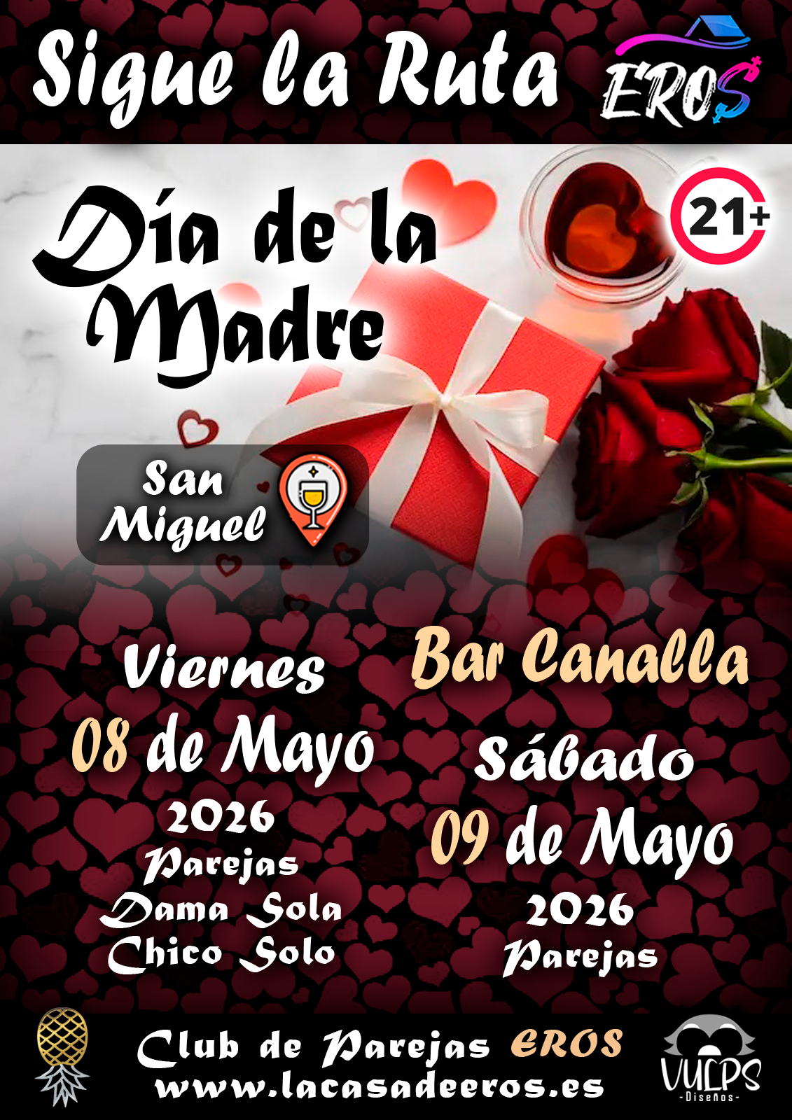 Viernes de 11 pm a 4:30 am "Noche de Reina de Corazones" Parejas, damas solas y Caballeros solos (máximo 8)